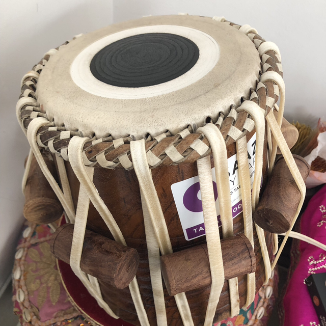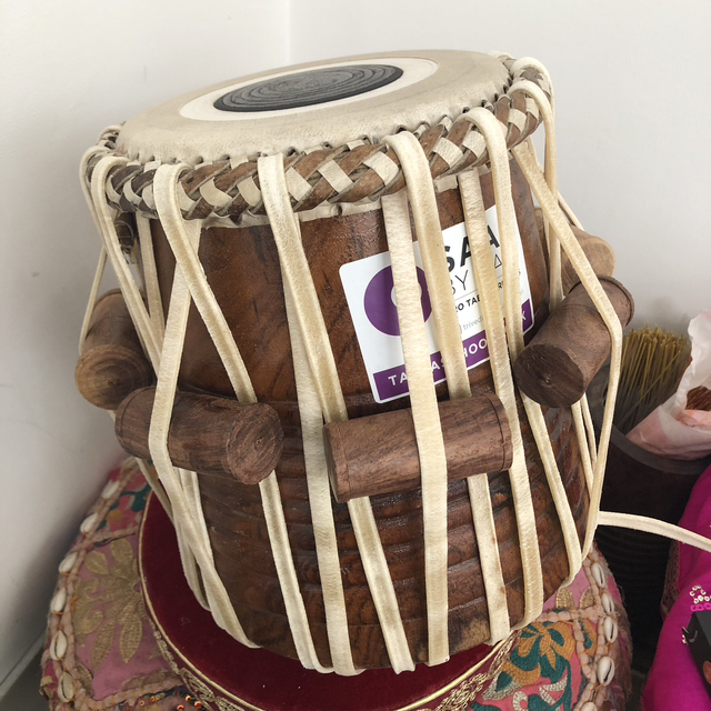 A heavyweight red shisham one of a kind tabla that I put together using a Muktadas 6.75 skin to reach scales in low pitch D to E. Lovely finish and balanced tone